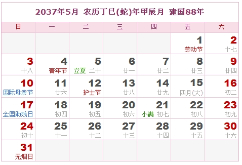 2037年5月 农历丁巳(蛇)年甲辰月 建国88年