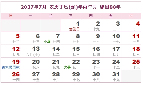 2037年6月 农历丁巳(蛇)年乙巳月 建国88年