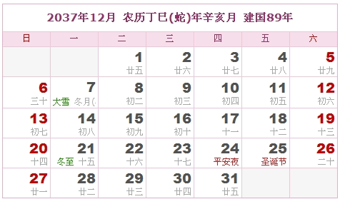 2037年12月 农历丁巳(蛇)年辛亥月 建国89年