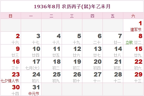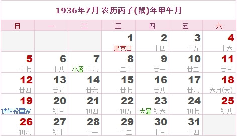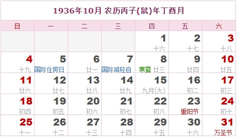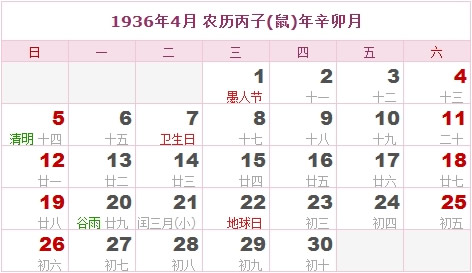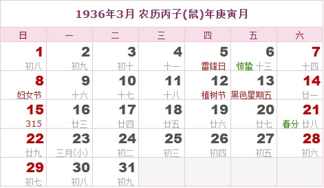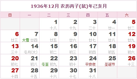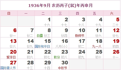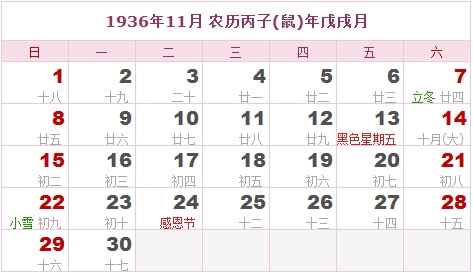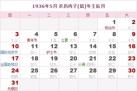此表为1936年的日历表、1936年农历表、1936年农历阳历表,含阴阳历、节日、二十四节气等。供大家参看。