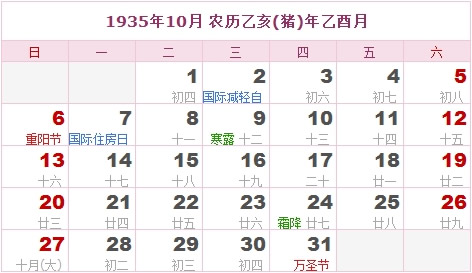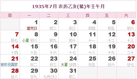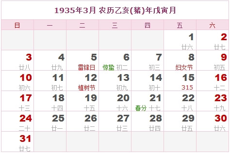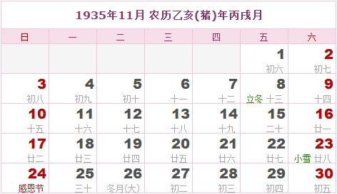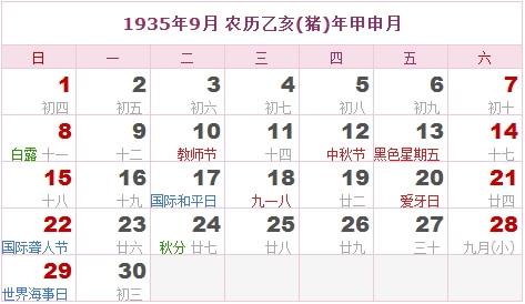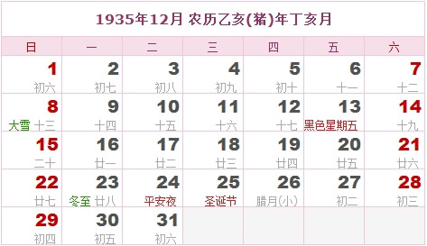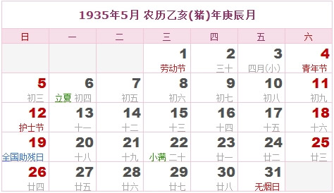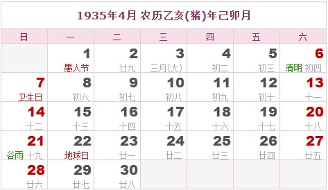 此表为1935年的日历表、1935年农历表、1935年农历阳历表,含阴阳历、节日、二十四节气等。供大家参看。