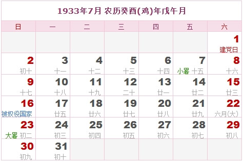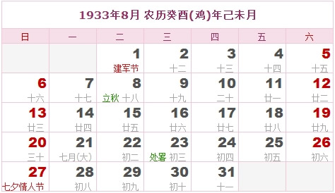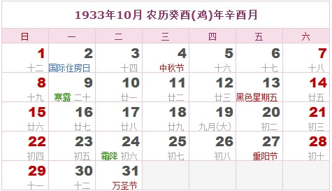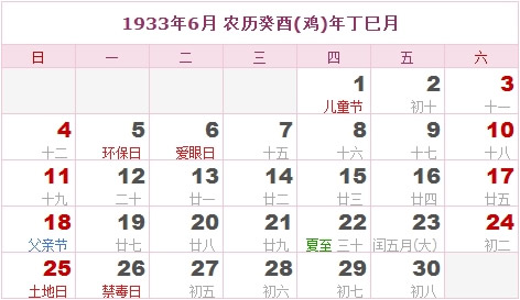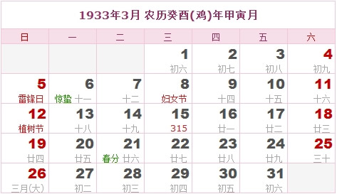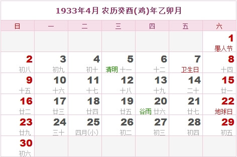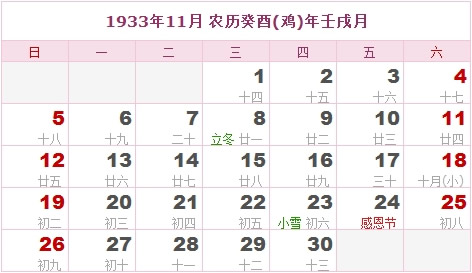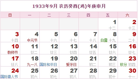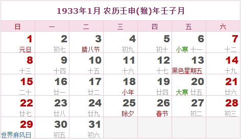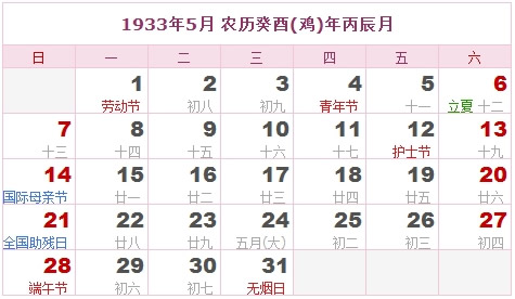 此表为1933年的日历表、1933年农历表、1933年农历阳历表,含阴阳历、节日、二十四节气等。供大家参看。