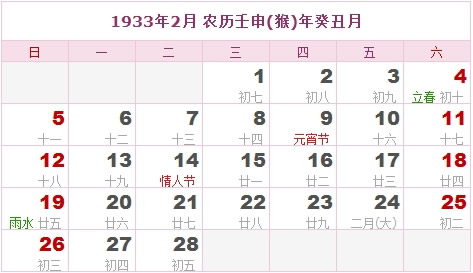 正如上面所说的,生肖纪年法是以农历立春为新年的开始,而1933年立春时间为1933年2月4日。