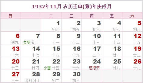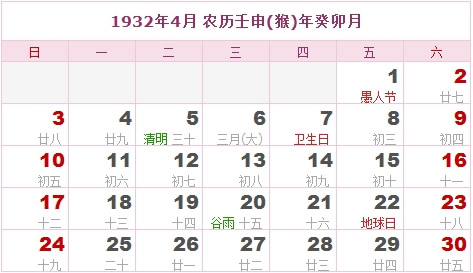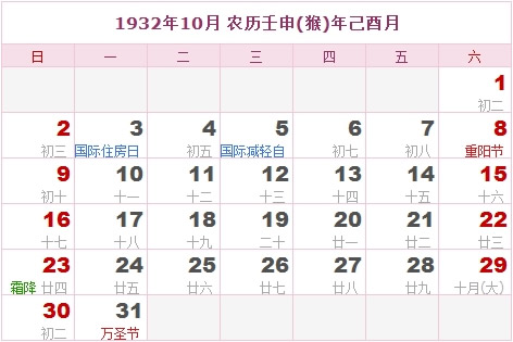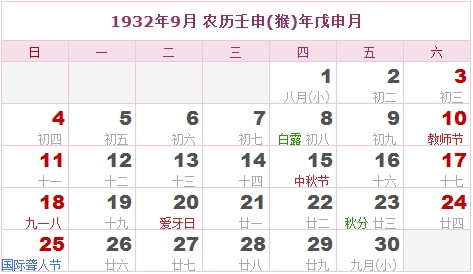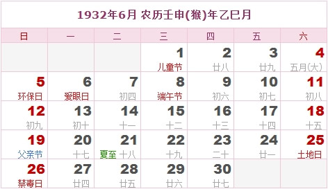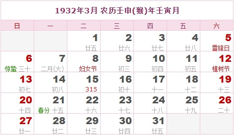 此表为1932年的日历表、1932年农历表、1932年农历阳历表,含阴阳历、节日、二十四节气等。供大家参看。