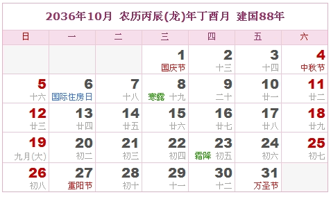 2036年10月 农历丙辰(龙)年丁酉月 建国88年