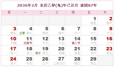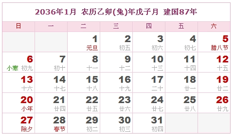 2036年1月 农历乙卯(兔)年戊子月 建国87年