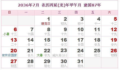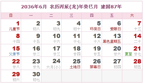 2036年6月 农历丙辰(龙)年癸巳月 建国87年