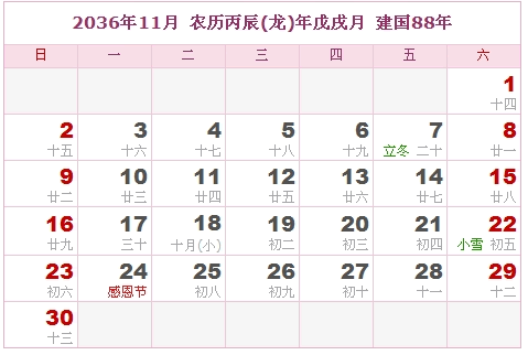 2036年11月 农历丙辰(龙)年戊戌月 建国88年
