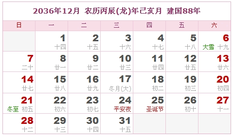 2036年12月 农历丙辰(龙)年己亥月 建国88年