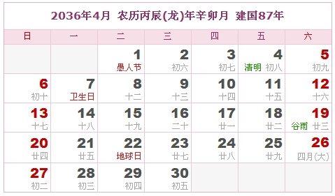 2036年4月 农历丙辰(龙)年辛卯月 建国87年