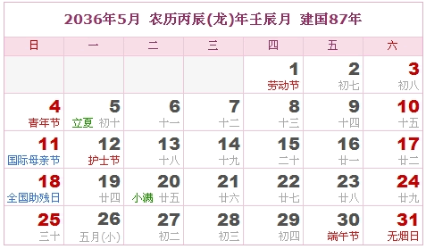 2036年5月 农历丙辰(龙)年壬辰月 建国87年