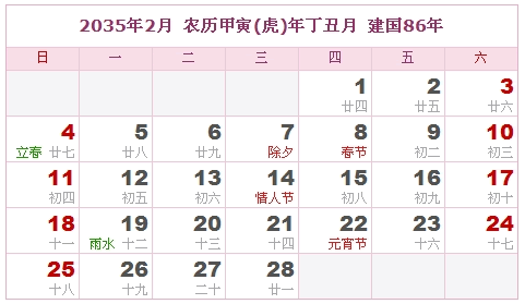 2035年2月 农历甲寅(虎)年丁丑月 建国86年
