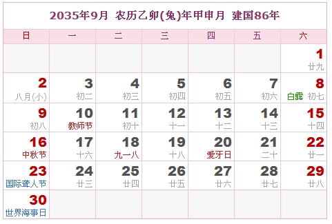 2035年9月 农历乙卯(兔)年甲申月 建国86年