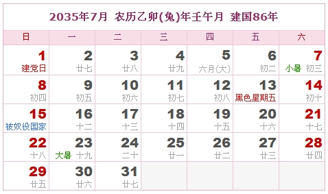 2035年7月 农历乙卯(兔)年壬午月 建国86年