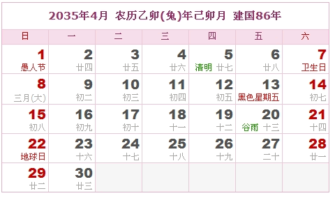 2035年4月 农历乙卯(兔)年己卯月 建国86年