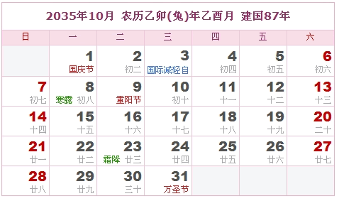 2035年10月 农历乙卯(兔)年乙酉月 建国87年