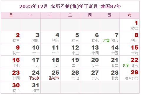 2035年12月 农历乙卯(兔)年丁亥月 建国87年