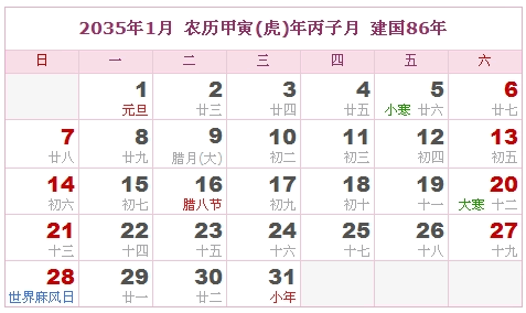 2035年1月 农历甲寅(虎)年丙子月 建国86年