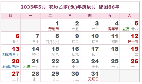 2035年5月 农历乙卯(兔)年庚辰月 建国86年