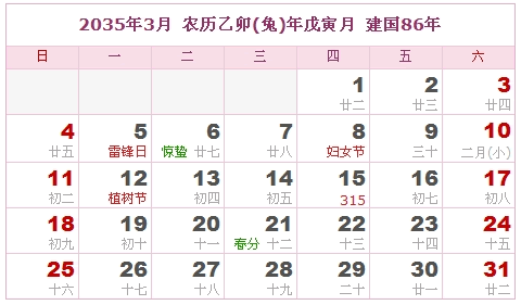 2035年3月 农历乙卯(兔)年戊寅月 建国86年