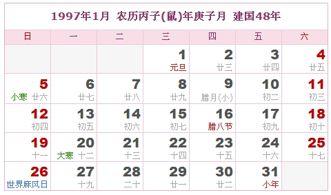 1997年1月 农历丙子(鼠)年庚子月 建国48年