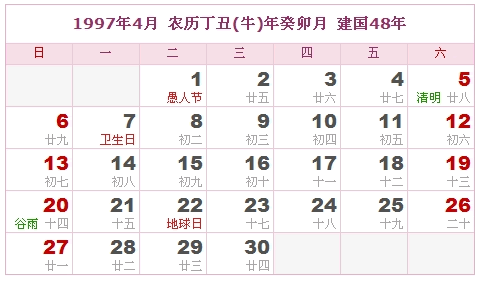 1997年4月 农历丁丑(牛)年癸卯月 建国48年