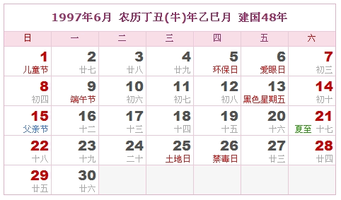1997年6月 农历丁丑(牛)年乙巳月 建国48年