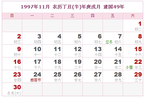1997年11月 农历丁丑(牛)年庚戌月 建国49年