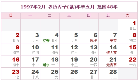 1997年2月 农历丙子(鼠)年辛丑月 建国48年