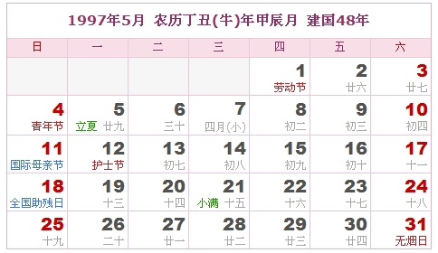 1997年5月 农历丁丑(牛)年甲辰月 建国48年