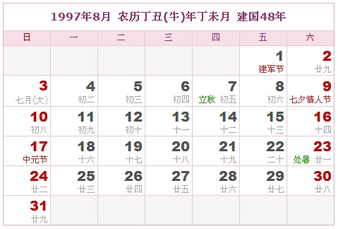 1997年8月 农历丁丑(牛)年丁未月 建国48年
