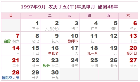 1997年9月 农历丁丑(牛)年戊申月 建国48年