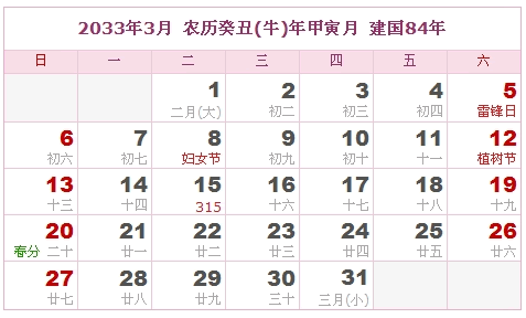 2033年3月 农历癸丑(牛)年甲寅月 建国84年