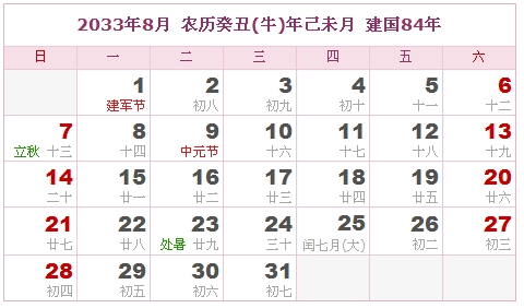 2033年8月 农历癸丑(牛)年己未月 建国84年