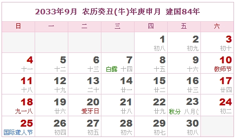 2033年9月 农历癸丑(牛)年庚申月 建国84年