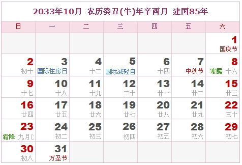 2033年10月 农历癸丑(牛)年辛酉月 建国85年