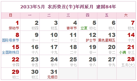 2033年5月 农历癸丑(牛)年丙辰月 建国84年