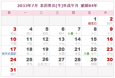 2033年7月 农历癸丑(牛)年戊午月 建国84年