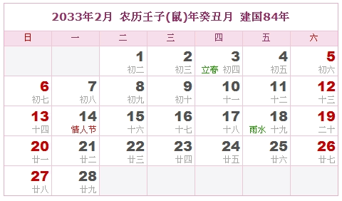 2033年2月 农历壬子(鼠)年癸丑月 建国84年