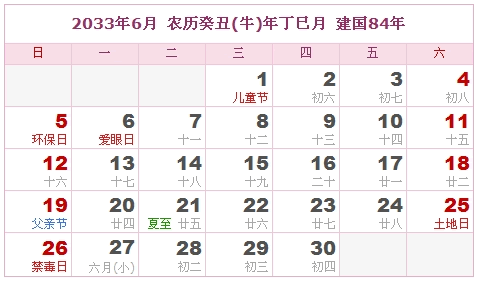 2033年6月 农历癸丑(牛)年丁巳月 建国84年