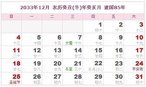 2033年12月 农历癸丑(牛)年癸亥月 建国85年
