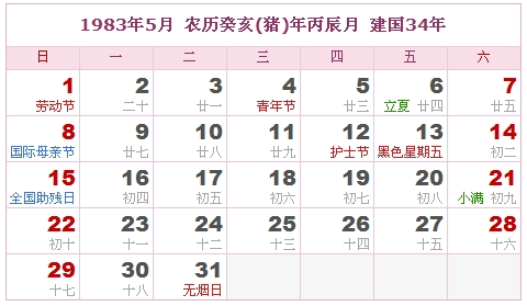 1983年5月 农历癸亥(猪)年丙辰月 建国34年