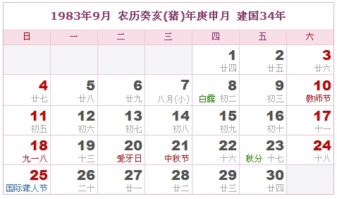 1983年9月 农历癸亥(猪)年庚申月 建国34年