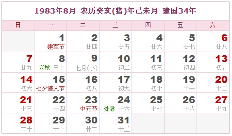 1983年8月 农历癸亥(猪)年己未月 建国34年