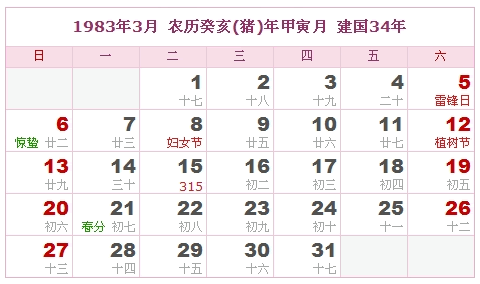 1983年3月 农历癸亥(猪)年甲寅月 建国34年