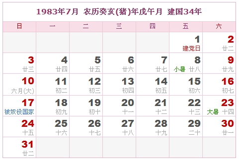 1983年7月 农历癸亥(猪)年戊午月 建国34年