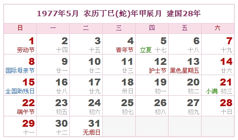 1977年5月 农历丁巳(蛇)年甲辰月 建国28年