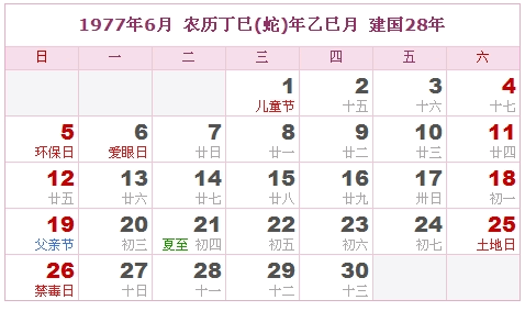 1977年6月 农历丁巳(蛇)年乙巳月 建国28年