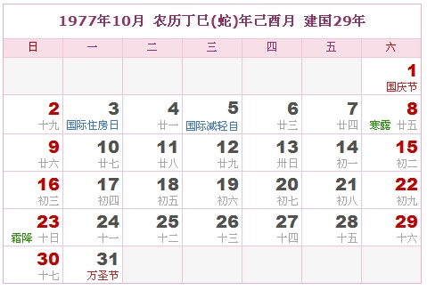 1977年10月 农历丁巳(蛇)年己酉月 建国29年