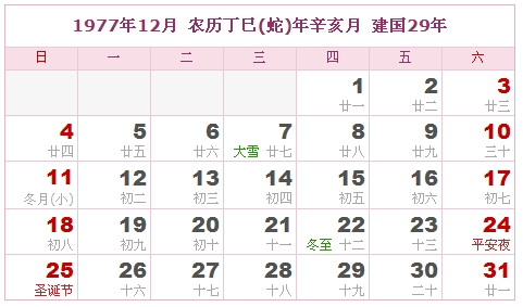 1977年12月 农历丁巳(蛇)年辛亥月 建国29年